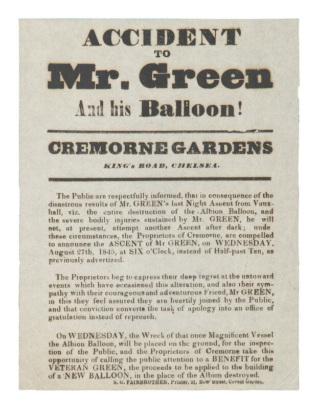 GREEN, Charles (1785-1870). Accident to Mr. Green and his Balloon! London: S.G. Fairbrother, [1845]. 4 15/16 x 6 5/8 in. letterpress broadside (very minor creasing); framed to 9 1/2 x 11 1/4 in. (not examined out frame).