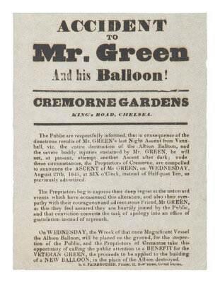 A small broadside announcing that "in consequence of the disastrous result of Mr. Green's last Night Ascent from Vauxhall, vix. the entire destruction of the Albion Baloon, and severe bodily injuries sustained by Mr. Green" that scheduled ballooning events were canceled. The organizers apologize and announce that the "Wreck of that once Magnificent Vessel" would be displayed for public viewing with proceeds going to "a BENEFIT for the VETERAN GREEN, the proceeds to be applied to the building of a NEW BALLOON."