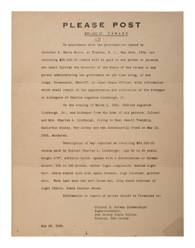 Please Post. $25,000 Reward. Typed kidnapping reward notice issued by the New Jersey State Police seeking information as to the whereabouts of Charles Lindbergh, Jr., the son of American aviator Charles Lindbergh. 26 May 1932. 1p, 8 x 10 1/2 in. (creasing at folds, hole at top from posting). Partial watermark at bottom left center.