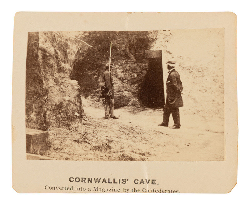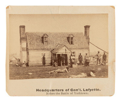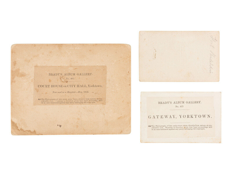 2 mounted albumen photographs, each approx. 3 x 2 in., mounted recto/verso on cardstock with printed captions below: "Headquarters of Gen'l. Lafyette. / Before the Battle of Yorktown" and "Cornwallis' Cave. / Converted into a Magazine by the Confederates." Black soldiers stand and recline in the grass in the image featuring Lafayette's headquarters. -- 2 mounted albumen photographs, each approx. 3 1/4 x 2 1/4 in. on cardstock mounts with BRady's copyright printed to lower margin and paper labels affixed to verso, one being a "Brady's Album Gallery" label identifying the image as "No. 413 / Gateway, Yorktown" and the other providing caption only "North-East View of Battery, No. 1 / At Farnhold's House, York River, mounting 5 100-pound and 1 200-pound rifled guns." -- 4 1/2 x 3 1/4 in. albumen photograph on cardstock mount with Brady's copyright to lower margin and "Brady's Album Gallery" label on verso, identifying image as "No. 405. / Court House or City Hall, Yorktown, / Now used as a Hospital—May, 1862." Significant soiling. -- Together, 5 photographs, including 2 mounted on the same card.