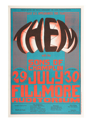 WILSON, Wes, artist. Presented by Bill Graham in San Francisco / Last US Appearances This Year / Them / with Sons of Champlin. 1966. San Francisco, CA: West Coast Lithograph Co., 1966. BG-20, second print poster. 20 1/2 x 13 3/4 in. -- BLASHFIELD, Jim, artist. Bill Graham Presents in San Francisco / The Opening of the Fall Weekend Series / The Byrds... September 1967. San Francisco, CA. BG-82. 21 x 14 in. -- Together, 2 posters.