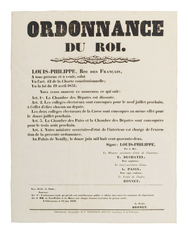 Châteauroux, France: Typographie de ve Teisserenc-Bayvet, 14 June 1842. 20 3/8 x 15 3/4 in. printed broadside, framed to 25 1/4 x 19 1/4 in. Signed in type by King Louis-Philippe, T. Duchatel, A. Passy, and Le Préfet de l'Indre, Bonnet.