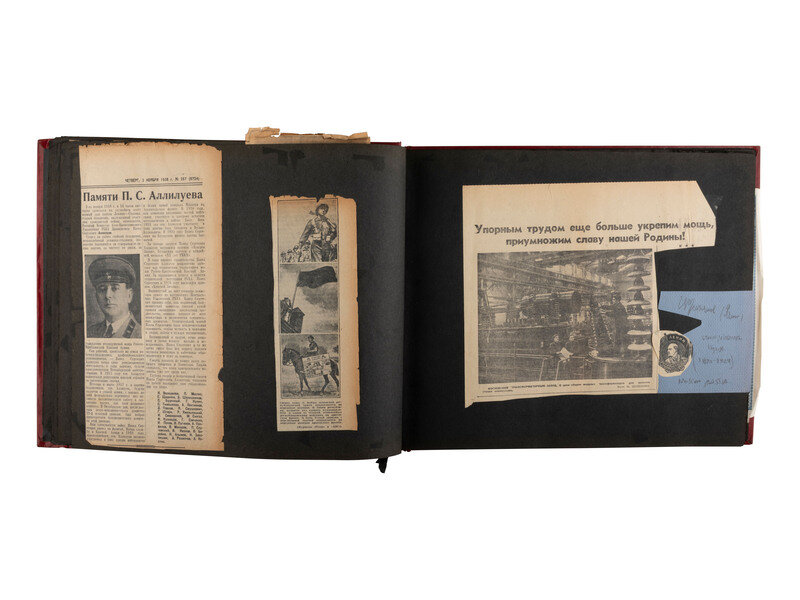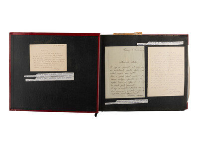 Red string-bound scrapbook, 27pp, 14 x 11 in., identified on cover with modern label: "US Documents relating to business, stocks, bonds, etc. / High ranking officials writings. Russian and Romanian early 1800s to 1938, Scrapbook. Stalin, Lenin, Romanian Kings and Queens writings." One signature identified as Vladimir Lenin. A large number of additional items housed within such as letters, newspaper clippings, stock certificates, and more.