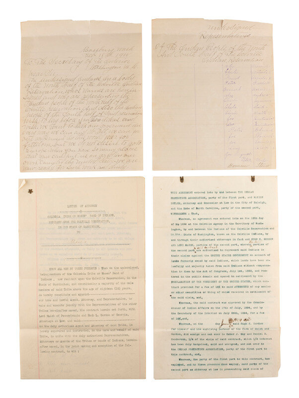 [With:] Letter addressed "To the Secretary of the Interior / Washington, D.C." [Franklin K. Lane], Bassbury, Washington, 18 February 1918, 2pp, undersigned by members of the "Indian Peoples of the North and South Half of the Colville Indian Reservation," indicating a desire to serve their country in the ongoing war but requesting to be placed on guard within the United States and not in Europe. With the signatures or marks of 18 identified tribal members. -- "Proposed Contract / Indian Protective Association [Indians of Colville Reservation] with [Attorney] Marian Butler," 14 December 1903, 3pp. -- Copy of "Colville Power of Atty. Columbia Tribe to Moses." 28 March 1894, 8pp, includes the names of 92 tribal members as witnesses.
