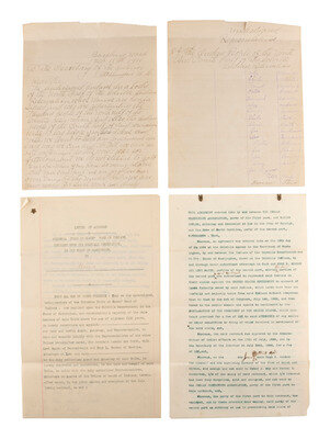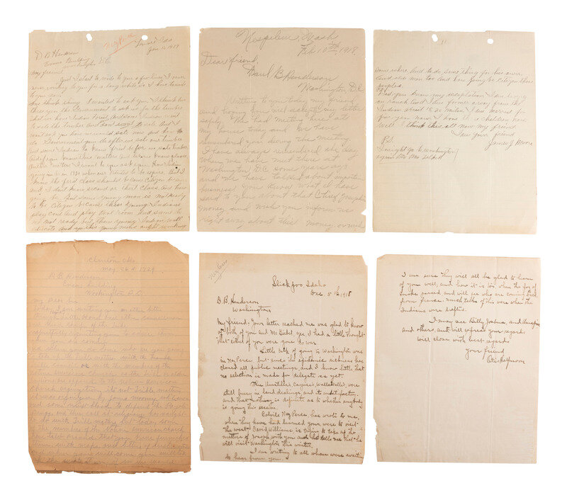 A group of 3 letters addressed to attorney Daniel B. Henderson, and associated with the Nez Perce, comprising: letter from Chief David WILLIAMS ("Interpreter or Written by Henry Wilson"), Nespelem, Washington, 10 February 1918, 2pp, recalling their meeting in Washington, DC years before, and wishing to be informed regarding "Chief Joseph's money" and "how we would ever get that money for we Indians here are very much in need of money right now...." -- ALS from Otis HALFMOON, Slickpoo, Idaho, 5 December 1918, 2pp, with reference to the "epidemic sickness" [1918 flu pandemic] and WWI, "we will see who are coming back from France, much talks of this were when the Indians were drafted." -- ALS from James J. MOORE, Lenore, Idaho, 11 January 1919, 2pp, with reference to the sale of timber on Indian lands to the government, efforts to become a citizen, and family updates. -- A 4th letter addressed to Henderson, from John OTTERBY, Cheyenne Head Man and former Indian Scout, Clinton, Oklahoma, 26 May 1924, 2pp, regarding tribal matters, most notably the opposing views of tribal elders and the "Native American church" with its defense of "the Payote Drugg."