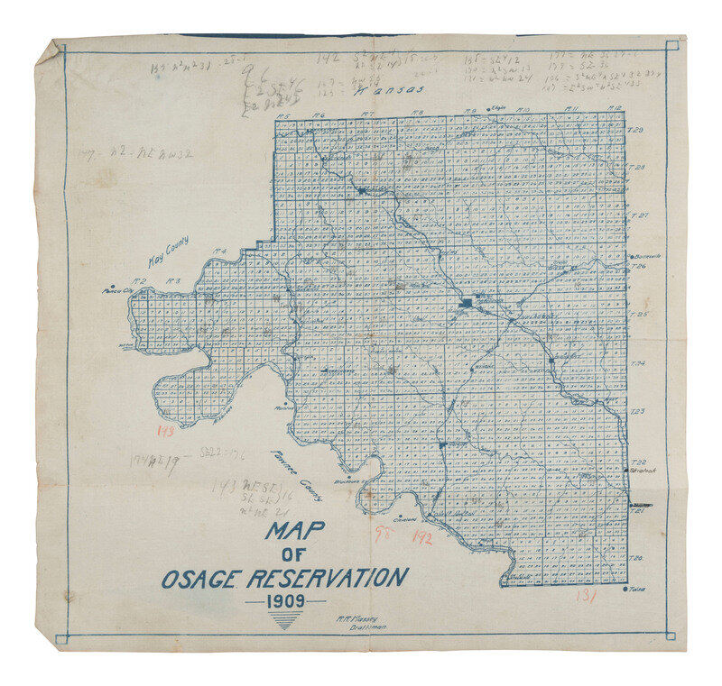 In the 19th century, the Osage were forced by the United States to move from modern-day Kansas into Indian Territory (present-day Oklahoma). In the late 19th and early 20th century, oil was discovered on their land. Mineral reserves were given by law to the Osage Nation in 1906. In 1907 individual tribal members were given “headrights” or shares of income from the mineral rights held by the tribe. This section, township and range map was created just after these historic events. Many Osage became wealthy through returns from leasing fees generated by their headrights, but during the 1920s "Reign of Terror" they suffered manipulation, fraud, and murders by outsiders eager to take over their wealth.