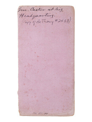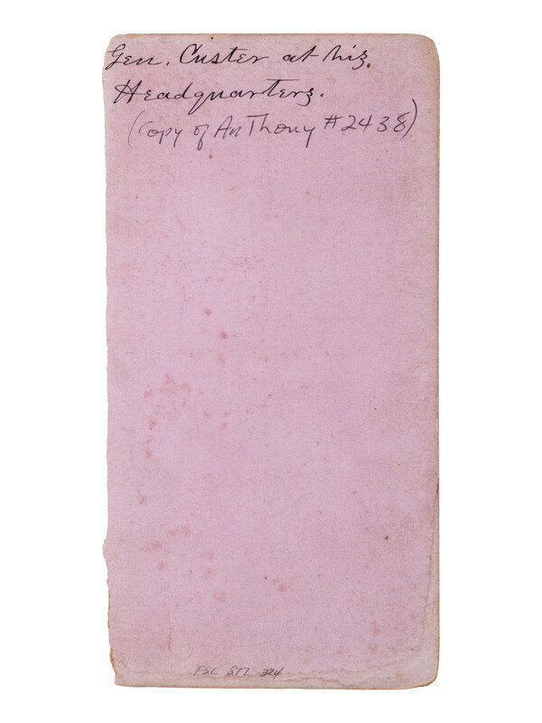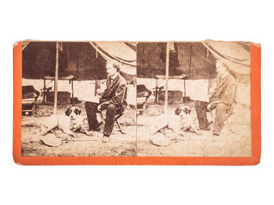 Stereoview on orange cardstock mount (toning, soiling, loss to upper edge of mount and wear to edges). Verso with ink inscription reading, in part, "Gen. Custer at his Headquarters." Features Custer seated in a camp chair, with his trusty canine companion sitting at his feet.