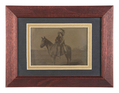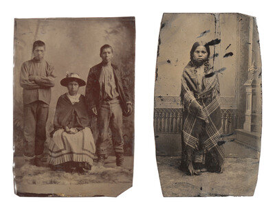 4 3/8 x 3 in. (sight) outdoor tintype featuring a Native American man wearing a large headdress and riding a horse (quite soft focus, a bit faded, dark). Housed under modern mat and frame, unexamined out of the frame. -- 2 1/4 x 3 7/8 in. loose tintype featuring a young girl with braded hair and with a large plaid blanket wrapped around her (very worn at edges, with bends and dents and several losses and/or ink blots to image). -- 2 1/2 x 3 3/4 in. loose tintype featuring a group of 3 young, possibly adolescent or teenage, subjects wearing Anglo-style clothing (creases and bends to plate, with clipping to corners and edges, and some abrasions to image). -- Together, 3 tintypes.