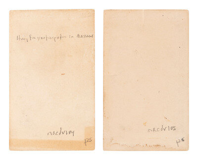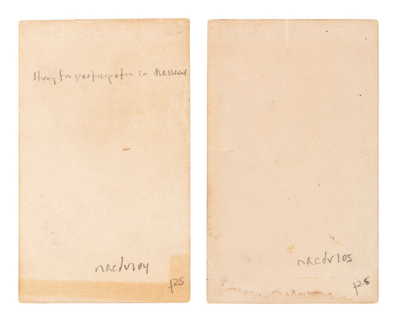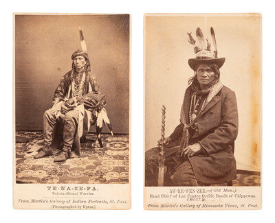 2 CDVs on cardstock mounts. The subjects, identified on mount rectos, include: Ten-na-ze-pa, Dakota (Sioux) Warrior. Photographed by Upton. St. Paul, MN: Martin's Gallery of Indian Portraits. Te-na-ze-pa was one of the 38 who were executed for their role in the Minnesota Massacre of 1862. -- Aw-ke-wen-zee.—(Old Man.) Head Chief of Lac Contre Oreille Bands of Chippewas. St. Paul, MN: Martin's Gallery of Minnesota Views. -- Together, 2 CDVs (rich tonality, some spotting and discoloration).