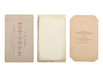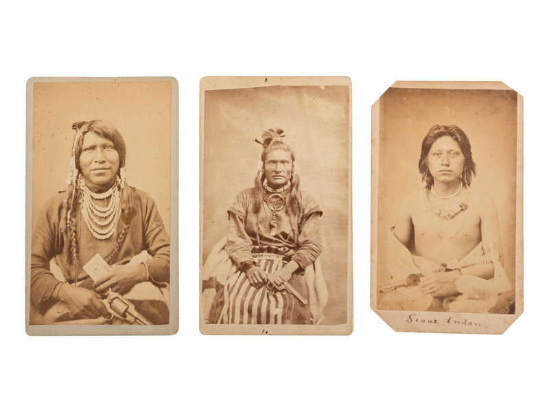 3 CDVs on cardstock mounts, including the following subjects: Seated view of "Indian Charley, Ute," as identified on verso, holding a New Model '58 revolver in one hand, and what appears to be a card in the other. Salt Lake City, UT: C.R. Savage, Fine Art Bazar. -- Seated portrait of a "Sioux Indian," as identified in lower margin. The young man is shown cradling a tomahawk. Omaha, NE: Jackson Bro's Photographers (corners clipped). -- Portrait of an unidentified male subject, possibly a Plains Indian, seated with a Smith & Wesson in hand. Uncredited. -- Together, 3 CDVs.
