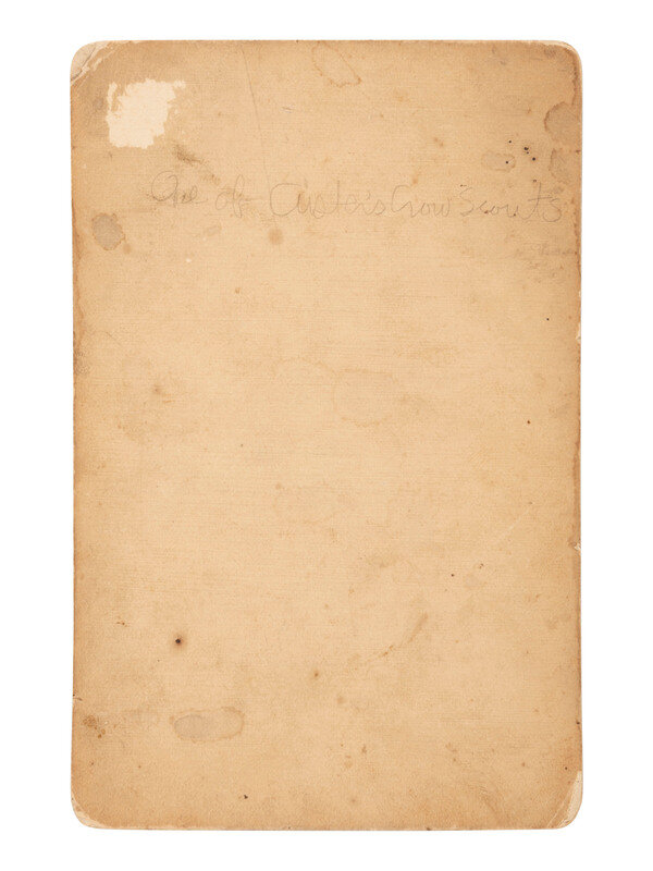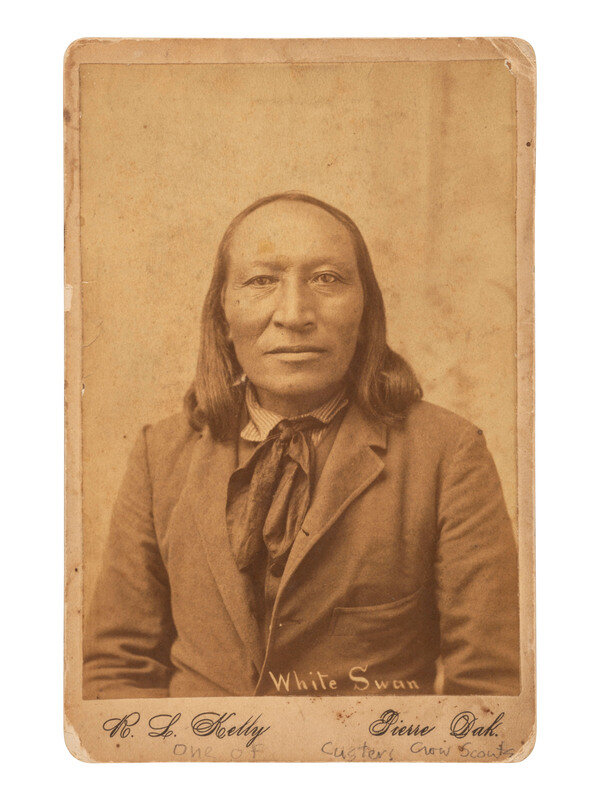 Cabinet photograph of White Swan wearing a suit coat and cravate. Recto imprint of R.L. Kelly, Pierre, Dakota, and modern penciled notations on recto and verso identifying Kelly as one of George Custer's Crow scouts. Ca 1880s.