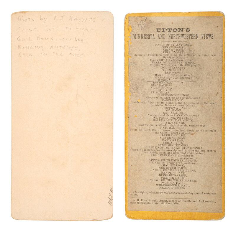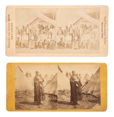 Group Siouxs [sic]. Stereoview from the American and Foreign Views "New Educational Series." Lacking his imprint but by F. Jay Haynes, Fargo, Dakota Territory, showing "Noted Sioux Indian Chiefs," as titled on a different example, with the subjects identified as Hump, Rain in the Face, Gall, Low Dog, Running Antelope, and Spotted Eagle, taken at Fort Yates on the Standing Rock Reservation, Dakota, in the summer of 1881. Note that Rain-In-The-Face is holding a cabinet card, perhaps his own likeness, previously taken by Haynes. Modern penciled notation on verso. -- Winona. St. Paul, MN: Upton. Stereoview of a young Sioux woman at camp. Applied paper label on verso with "Upton's Minnesota and Northwestern Views" imprint and list of titles from the series.