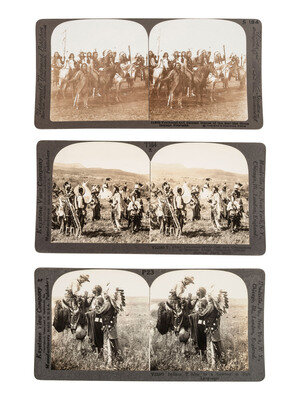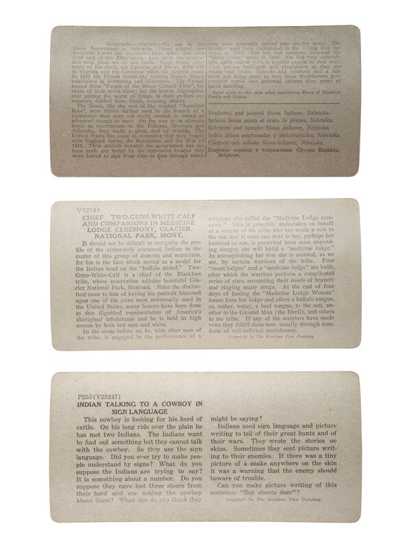 [With:] 2 stereoviews published by Keystone View Co., each titled in lower margin. Includes Indians Talking to a Cowboy in Sign Language, and Chief Two-Guns White-Calf and Companions in Medicine Lodge Ceremony, Glacier National Park, Mont. -- Stereoview published by Underwood & Underwood, titled in lower margin, Feathered and painted braves of the war-like Sioux Indians, Nebraska.