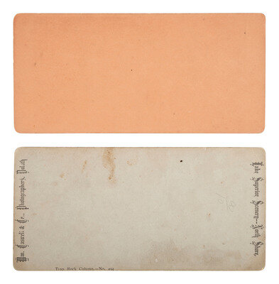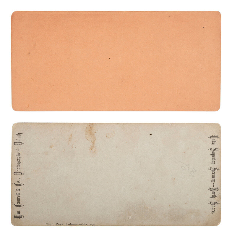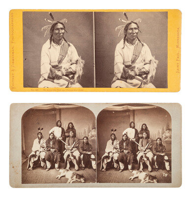 Group of Chippewa Indians. Duluth, MN: Wm. Caswell & Co., ca 1870-1880. Stereoview on cardstock mount. Verso with Wm. Caswell's "Lake Superior Scenery - North Shore" imprint and title. Studio group portrait of six unidentified Ojibwa Indian men posing before illustrated backdrop wearing mixtures of western and traditional clothing including blankets, otter fur hair wraps and hair feathers. One man holds a butcher knife while another holds hatchet. Note the sleeping dog in the foreground. -- To Keep the Net up. Chippewa Chief. St. Paul, MN: Whitney & Zimmerman, n.d. Stereoview on cardstock mount. Verso with Whitney and Zimmerman's imprint and title. Studio portrait of "To Keep the Net up" (also known as O-kun-de-kun), seated with butcher knife in hand, wearing a wool blanket, skunk skin armband, sash worn over shoulder, and hair ornaments. -- Together, 2 stereoviews.