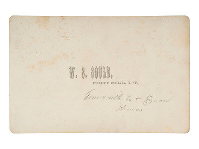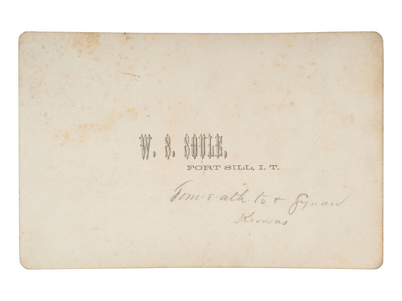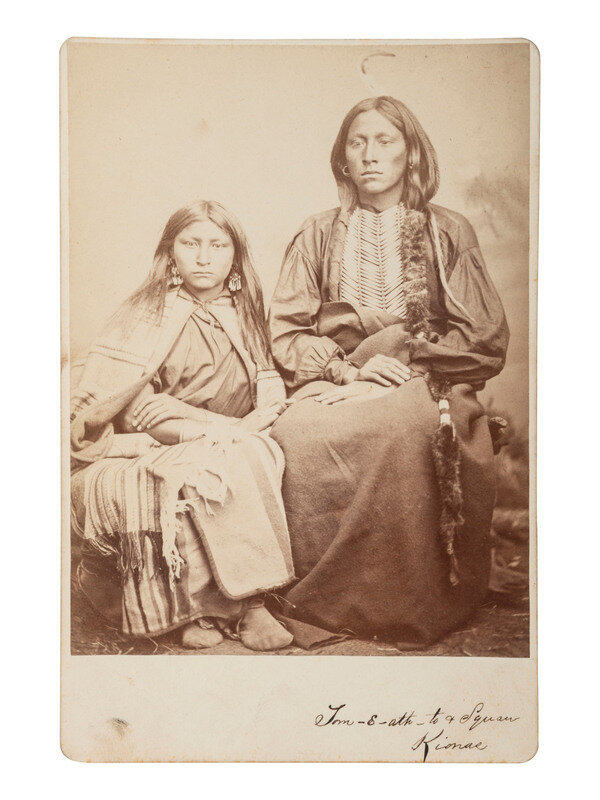Cabinet photograph on cardstock mount, with period inscription on mount below image, "Tom-e-ath-to & Squaw, Kiowas." Tom-e-ath's wife's name was Eonah-pah. Fort Sill, Indian Territory: W.S. Soule. Verso with photographer's imprint and penciled identification.