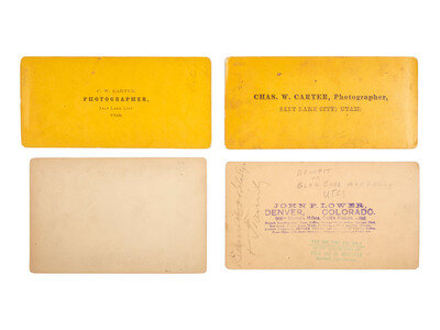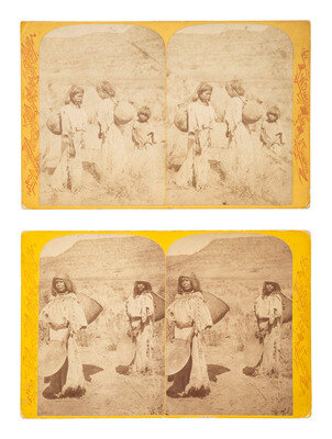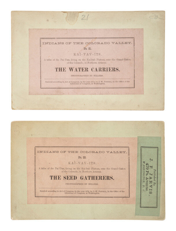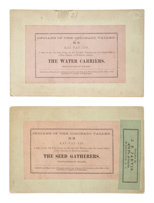[With:] 2 Powell Expedition stereoviews of Kai-Vav-Its, a Paiute tribe, by John K. Hillers. Rectos feature series titles and "US Topographical and Geological Survey of the Valley of the Colorado, By J.W. Powell and A.H. Thompson" imprint. Versos with applied paper labels including series title, image number and title, and credit to Hillers. Titles include The Water Carriers and The Seed Gatherers.