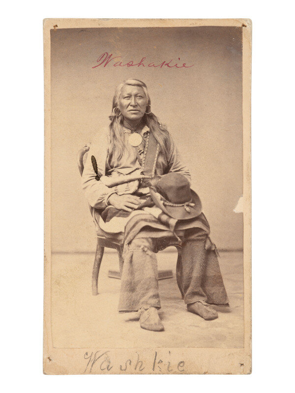 CDV on cardstock mount of Shoshone Chief Washakie seated in a chair, with a hat resting on his left knee. Uncredited, but originally photographed by Savage and Ottinger, ca 1865. He wears prominent earrings and a large medallion around his neck, which was given to Washakie by the President of the United States. With "Washakie" written in red ink in the top margin of the print, and additional penciled identification on mount below image.