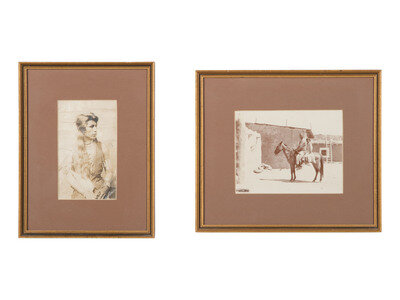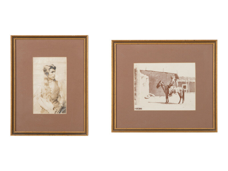 Seated portrait of Maragootch, a Shoshone warrior. Photographer's credit not visible, but originally taken by Baker & Johnston, ca 1890. 7 1/4 x 4 1/4 in. (sight) photograph, matted and framed, 10 x 13 in. (several creases, few possible tears/imperfections in print, not examined out of frame). -- Photograph of Navajo Indians on horseback, outside a dwelling. Copyrighted 1901 in negative by James Pierce of Los Angeles, CA. 6 x 8 in. (sight), matted and framed, 12 x 13 1/2 in. (few light creases in print, not examined out of frame).
