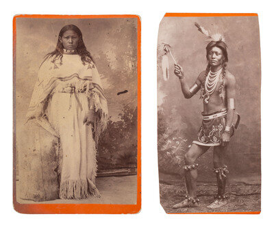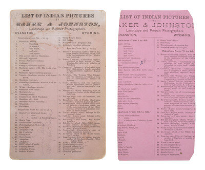 2 boudoir photographs, each credited to Baker & Johnston, Evanston, Wyoming, ca 1890. Versos with the photographer's imprint and "List of Indian Pictures." Subjects include: Peran in Sun Dance Costume (print and mount heavily trimmed). -- Sioux Squaw (toning, some soiling, edge and corner wear to mount).