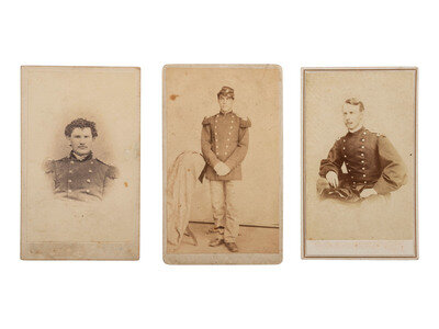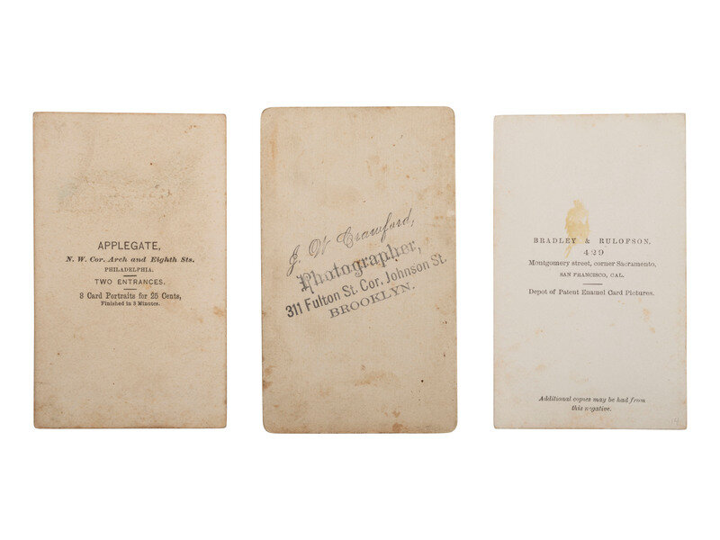 Full standing portrait of a postwar marine wearing a double-breasted frock coat with epaulettes and headgear with globe and anchor insignia attached at front (toning, soiling, some wear to print; mount with soiling and wear). New York: J. W. Crawford. Photographer's imprint on verso. -- Seated bust portrait of a curly-haired marine wearing a double-breasted coat and epaulettes (soiling and wear to print; and mount). Philadelphia: Applegate. Photographer's imprint on verso. -- Seated portrait of a marine wearing a double-breasted coat with shoulder braids and sitting in an upholstered studio chair with fringed arm (toning and spotting to print; mount with spotting and light wear/soil). San Francisco, CA: Bradley & Rulofson. Photographer's imprint on verso. -- Together, 3 CDVs.
