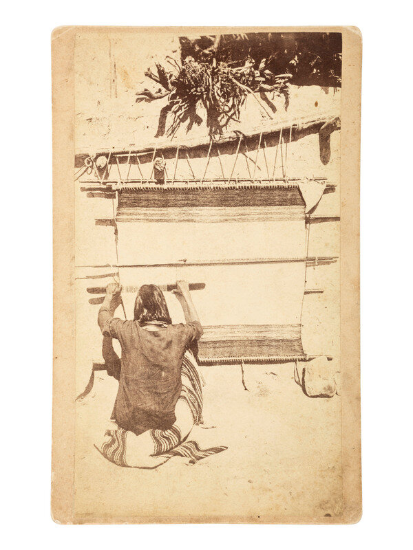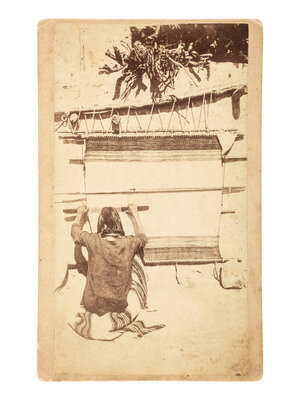 4 1/4 x 7 3/4 in. photograph on slightly larger cardstock mount featuring a Hopi man engaged in weaving (toning, soiling, some wear to print; soiling and wear to mount). The image is taken from behind the man, showing his back and the entirety of his weaving project. Published in Fowler's The Western Photographs of John K. Hillers as Image No. 81 (p 113). Verso bears printed paper label with information about "The Pueblo Indians" along with modern pencil inscriptions.