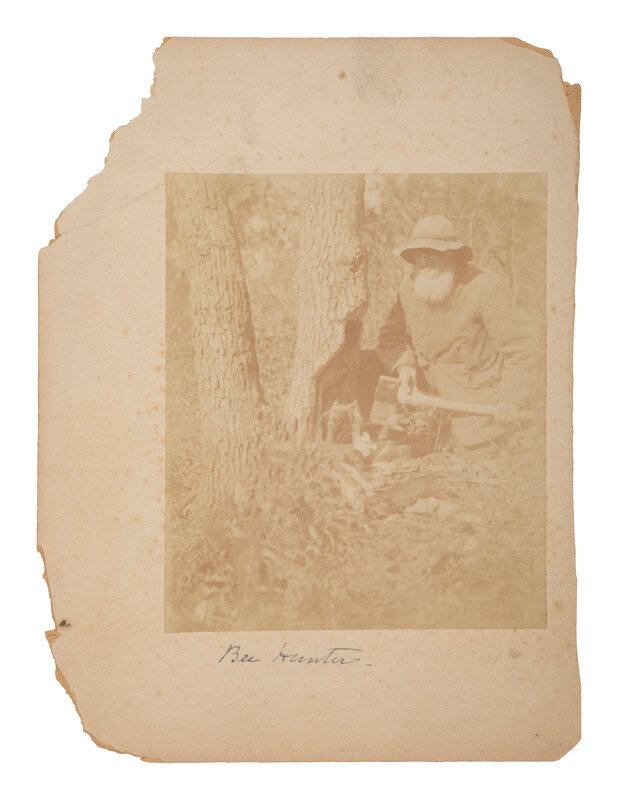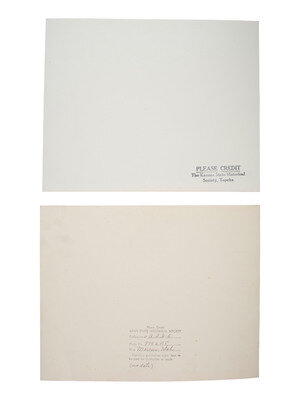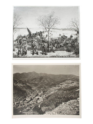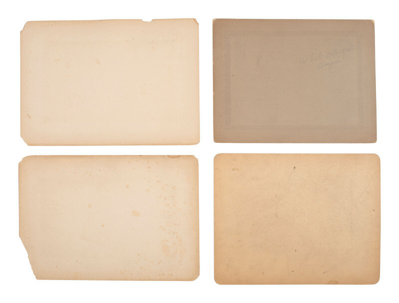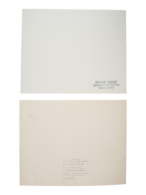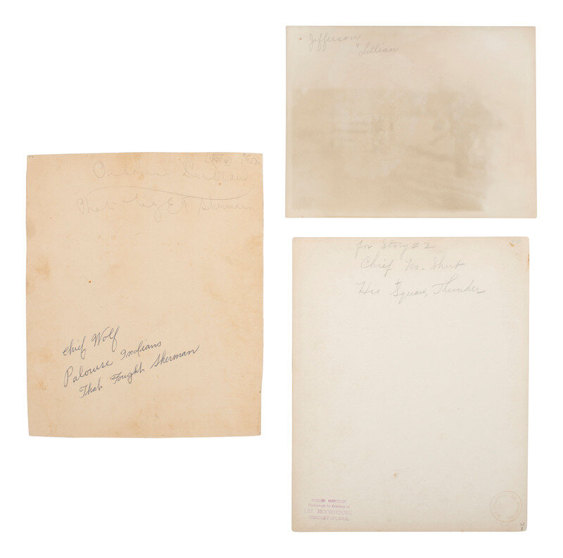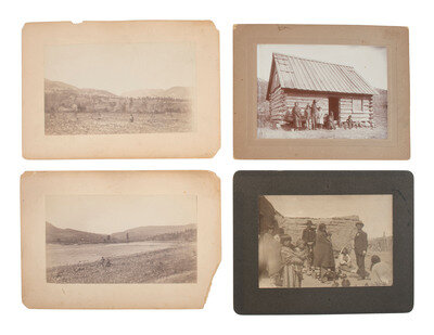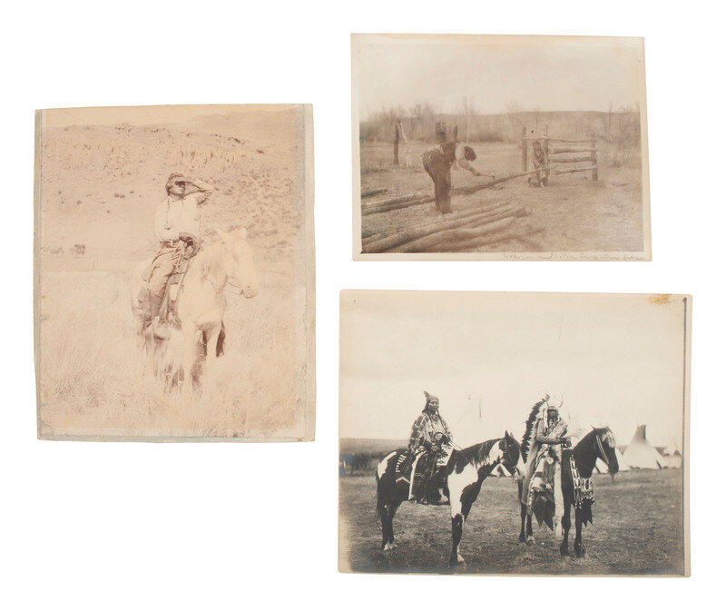 6 3/4 x 4 5/8 in. mounted silver gelatin photograph on larger cardstock mount (toning, some soiling and wear to print; mount with some residue and pin holes). In the image, a pair of white men wearing suits and hats stand among a group of Native women and children working on pottery outside of a pueblo. -- 6 1/2 x 4 3/4 in. mounted silver gelatin photograph on larger cardstock mount (some toning and soiling/spotting to print; mount with soiling and wear). A Native American family poses, sitting and standing, outside of a log cabin. Captioned in the negative, "Indian Log Cabin." -- 7 1/2 x 9 3/8 in. mounted silver gelatin photograph on slightly larger cardstock mount, trimmed (significant toning, soiling, wear to print; mount with significant soiling and trimming along edges). A Native American man looks into the distance with his hand blocking the sun from his eyes, on horseback. Verso with pencil and ink inscriptions identifying the subject as Chief Wolf, of the Palouse Indians who fought Sherman. -- 8 x 10 in. unmounted silver gelatin photograph featuring a male and female Native American, each dressed in traditional garb and mounted on horseback (toning, soiling, wear). Verso pencil inscription identifies the pair as, "Chief No-Shirt & His Squaw, Thunder." Stamps also on verso identify the print to Lee Moorhouse, Pendleton, Oregon. -- And 6 others, including a reproduction of an illustration of a battle. Conditions vary. -- Together, 10 images.