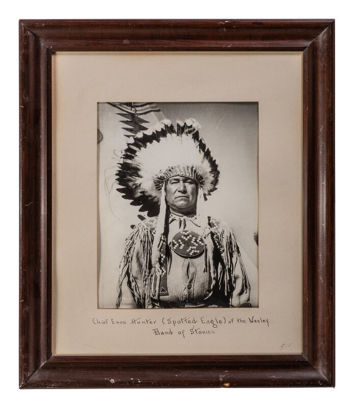 2 1/2 x 3 5/8 in. mounted silver gelatin photograph portrait of a possible Carlisle Indian School student wearing shoulder straps and two badges on his jacket. New York: Adams' Studio, n.d. -- CURTIS, Edward, photographer. A Cochitt Woman, 1925. 6 x 8 1/2 in. photogravure on tissue, mounted to 8 3/4 x 12 1/4 in. sheet of paper (image with adhesive residue to corners and some spotting, paper with spotting and wear). -- WILLIS, Joseph Roy, photographer. Framed hand-colored photograph of a child climbing a ladder on a Hopi structure, 9 x 12 3/4 in. overall. Signed bottom right "J. R. Willis." -- Typed letter signed ("J M Kelly") on Department of the Interior, U. S. Indian Service letterhead. Fort Belknap Agency, MT, 27 March 1895. Writing to a hardware company, Acting Indian Agent Major Kelly informs that he ordered two pump valves and only received one. -- A partly printed Pima County Bank document dated at Tombstone, AZ, 30 November 1881. Outlines funds remitted in the amount of $10,050.00. -- RINEHART, F. A., photographer. Chief War Path, Arapahoe. Omaha, n.d. Enlarged print, framed to 23 1/2 x 23 1/4 in. Signed in print by Rinehart, lower right. Titled in print, lower left. -- And 6 other items, including 4 large framed pieces. -- Together, 12 items.