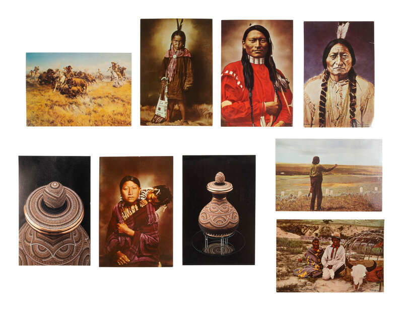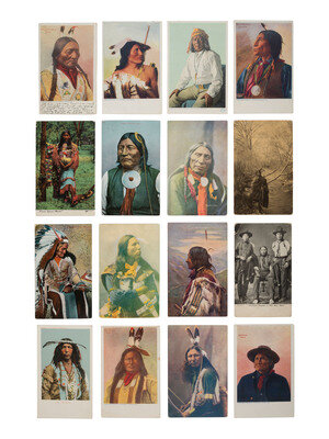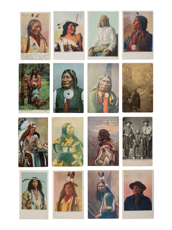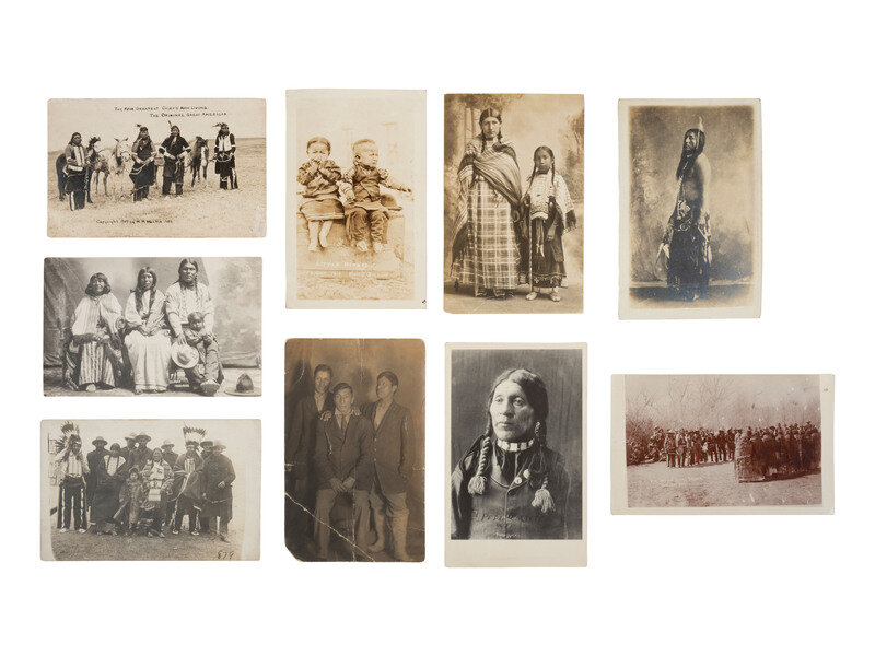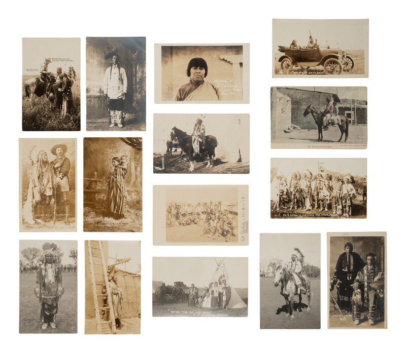 Lot comprised of approx. 45 real photo postcards and lithographed postcards, approx. 5 1/2 in. x 3 1/2 in., or smaller, some unused, featuring Native American subjects, including studio portraits, informal outdoor views, ceremonies, and dwellings. Many of the scenes are identified in the negative.