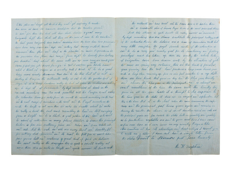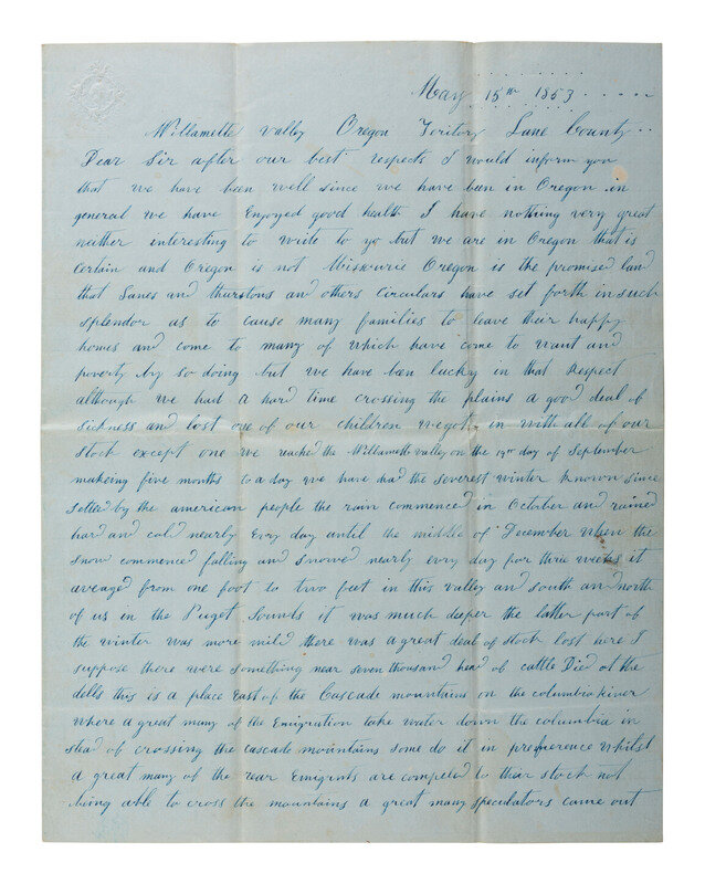 Hazleton, Royal Harvey (1819-1887). Autograph letter signed ("R.H. Hazleton"). "Willamette Valley Oregon Territory Lane County." 15 May 1853. 3pp, approx. 7 1/2 x 9 3/4 in. (creasing at folds, very small losses on page 3 at folds).