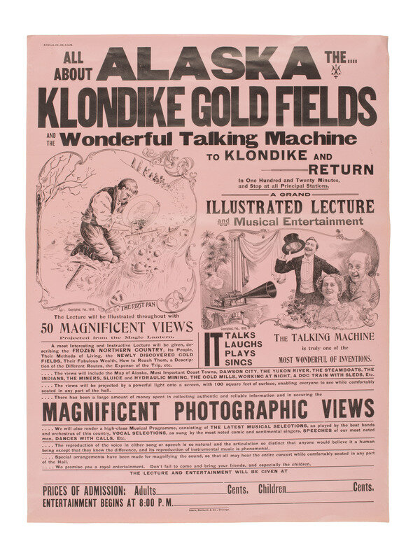 An unusual broadside issued by Sears promoting the Alaskan gold fields (and the equipment needed to travel to the Klondike) as well as the newly invented talking machine.