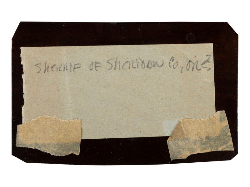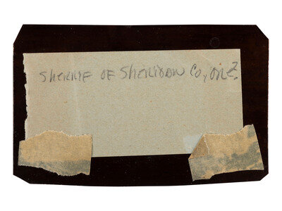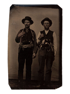 3 5/8 x 2 1/4 in. tintype of two well-armed men standing before a simple studio backdrop. The subject at right has multiple weapons tucked in his belt, most notably a Merwin, Hulbert, and Co. open-top Pocket Army revolver with a long barrel, which is very rare to see in photographs of the period. A Smith and Wesson new-model revolver and knife are also tucked in his belt. The subject at left appears to be triple armed, with a Colt Navy Model 1851 percussion revolver and double-action revolver tucked in his belt as well as a spur-trigger revolver tucked in his suspender. A paper label with modern inscription affixed to verso suggests that one of the subjects was a sheriff of Sheridan Co., Oregon, although this cannot be confirmed.