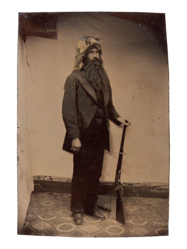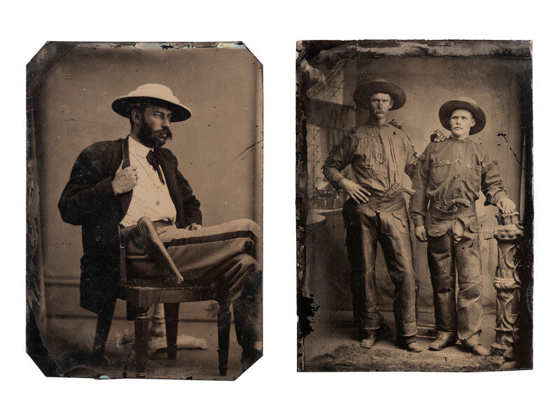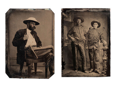 4 3/4 x 3 1/4 in. tintype, full-standing view of a curious fellow, possibly a frontiersman, sporting a long beard, wearing a fur cap/headdress. He poses before a simple studio backdrop comprised of a white canvas, holding a Winchester 1873 Saddle Ring carbine in one hand (slightly soft in focus, but very good overall). -- 3 3/8 x 2 3/8 in. tintype of two rough-and-tumble cowboys standing side by side in a studio setting, wearing wide-brimmed hats and fringed shirts. The character at left has a Starr Model 1863 single action percussion revolver tucked in his belt, possibly a studio prop. The subject at left is shown with an indiscernible pistol tucked in his belt (few light bends in plate). -- 3 1/2 x 2 1/2 in. tintype of a mustachioed man seated in a studio setting wearing an unusual hat and trousers with a wide strip down the side, suggesting that he may have served as a sergeant during the late Indian Wars. He is shown with a Smith and Wesson No. 3 revolver tucked in a holster attached to his belt (few light bends in plate).