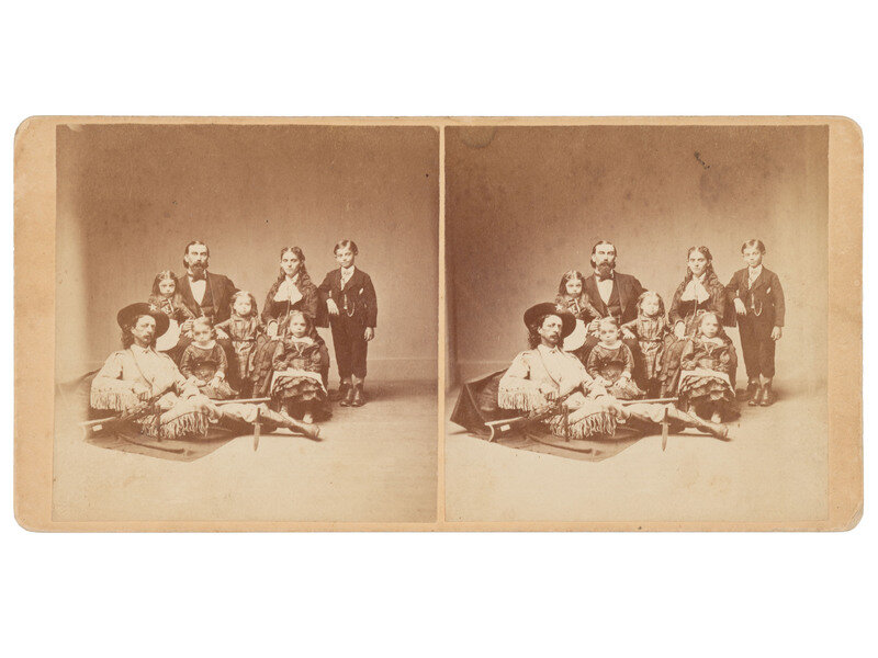 [WESTERN AMERICANA]. Stereoview portrait of Maj. Samuel S. "Buckskin Sam" Hall & the Dutcher family.