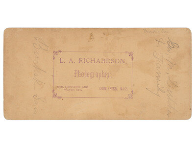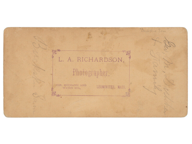 Stereoview on buff cardstock mount (light toning, some soiling, wear to edges and corners). Leominster, MA: L. A. Richardson. Verso bears Richardson's imprint along with penciled inscriptions including, "Geo. M. Dutcher & Family / Buckskin Sam."