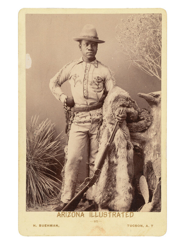 Full standing studio portrait of an African American man in head-to-toe cowboy gear including fringed pants and shirt, cartridge belt, and hat. Draped over his arm is a long fur pelt, and he holds the barrel of a long rifle in one hand (rich tonality, discoloration spot to left edge of print; mount with some soiling and light wear to edges/corners). Printed on mount recto beneath image: "Arizona Illustrated / By / H. Buehman, Tucson, A. T."