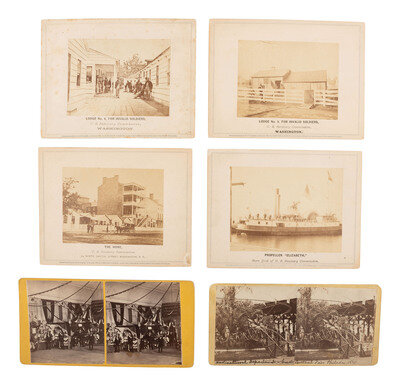 4 mounted albumen photographs of scenes and subjects related to the U. S. Sanitary Commission. Each captioned in print below image and copyrighted on mount recto by Alexander Gardner or GARDNER & GIBSON in 1862. Titles include: Lodge No. 4, for Invalid Soldiers -- Lodge No. 5, for Invalid Soldiers -- Propeller 'Elizabeth' -- and The Home. -- Together, 4 photographs, each approx. 3 7/8 x 2 7/8 in. on 6 x 4 1/2 in. mounts.