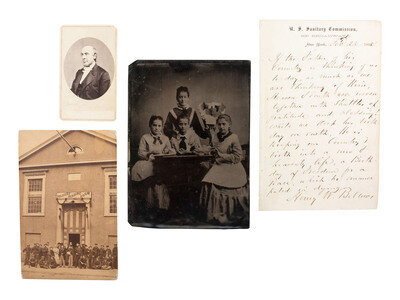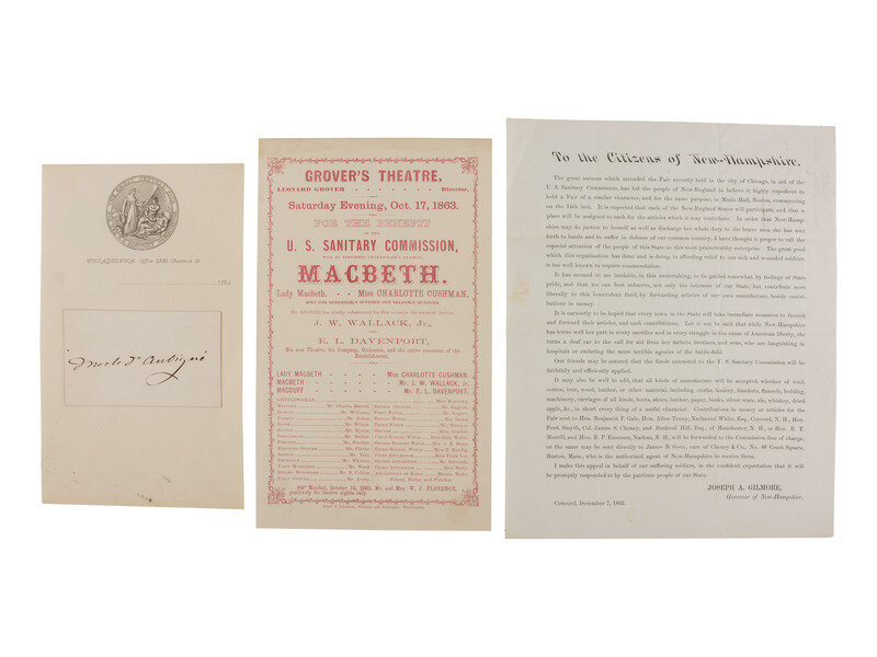 And 5 other items, including 2 stereoviews, a handbill for a performance of Macbeth for the benefit of the U. S. Sanitary Commission, a clipped signature of a Swiss theologian which was sold for the benefit of the Philadelphia Sanitary Fair in 1864, and a circular "To the Citizens of New-Hampshire" from Governor Joseph A. Gilmore.