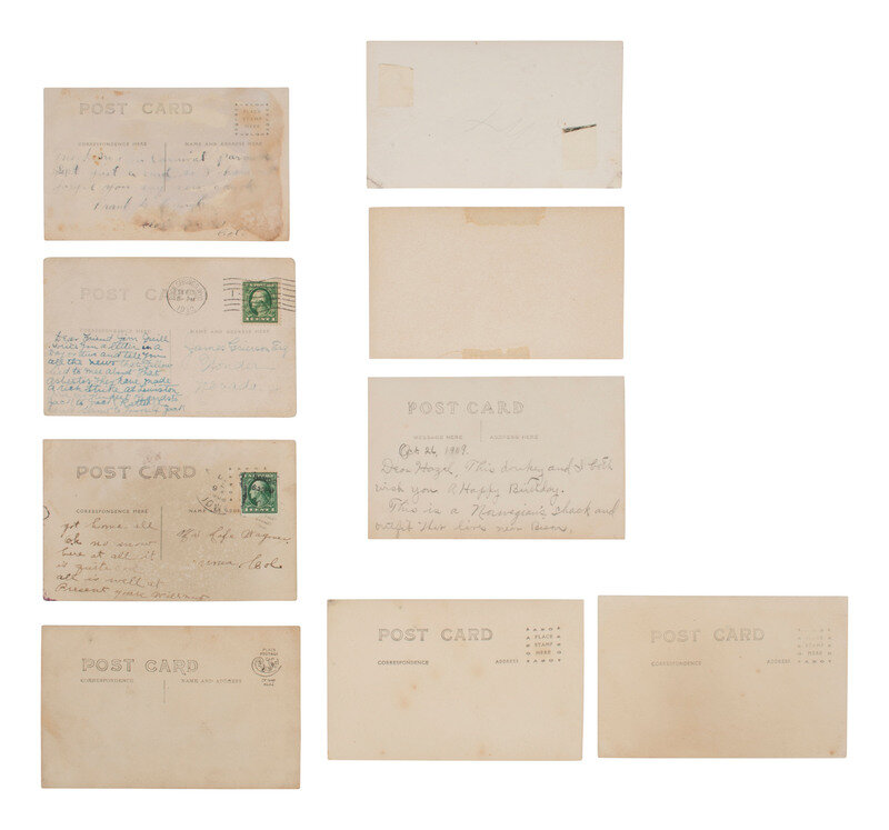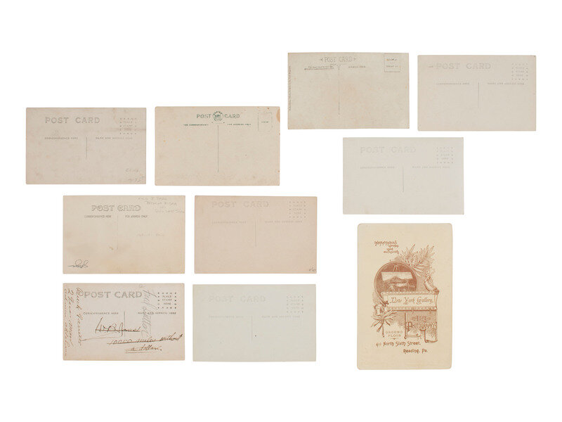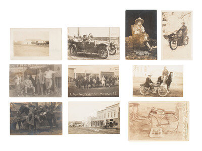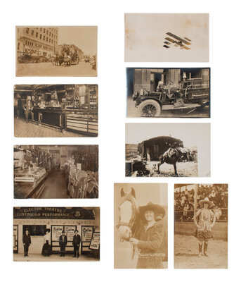 16 real photo postcards, most postally unused, featuring subjects including: female rider Ruth Roach, "Lady Champion," and her horse Buster. -- A dog riding a donkey. -- A group of people outside of a theater with signage advertising, "Electric Theatre, Continuous Performance." -- The interior of a saddle shop. -- Miss Lulu B. Parr, a "Bucking Bronco rider, Col. Cummins Wild West, England 1908." -- Two men, one on a horse and the other on an "Indian" motorbike. -- A group of men mounted on horseback outside of a storefront captioned, "C7 Boys Ready To Leave Town Morristown S. D." -- A street in Rosebud, MT. -- A white man driving 3 Native American subjects dressed in traditional garb in a car with "Atkinson's Wild West Circus" painted on the side. -- And many others.
