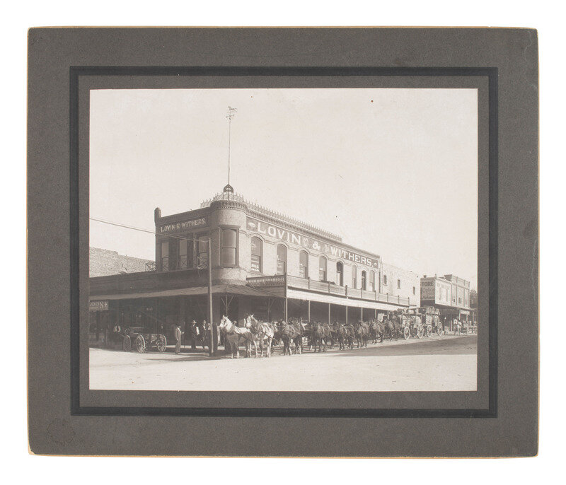 9 5/8 x 7 1/2 in. mounted silver gelatin photograph on larger cardstock mount (some spotting, soiling). Image features a street scene in Kingman, Arizona, showing a large team of horses attached to a few wagons just outside of a storefront with large sign reading, "Lovin & Withers."