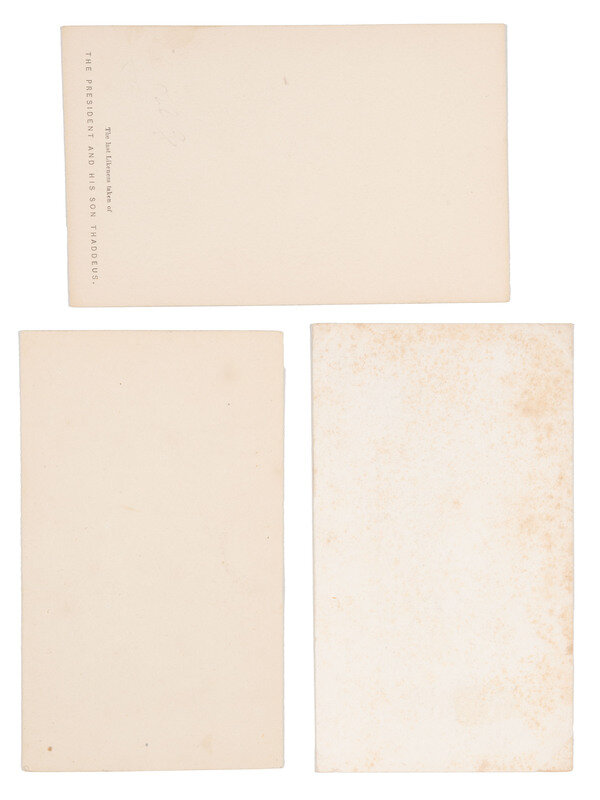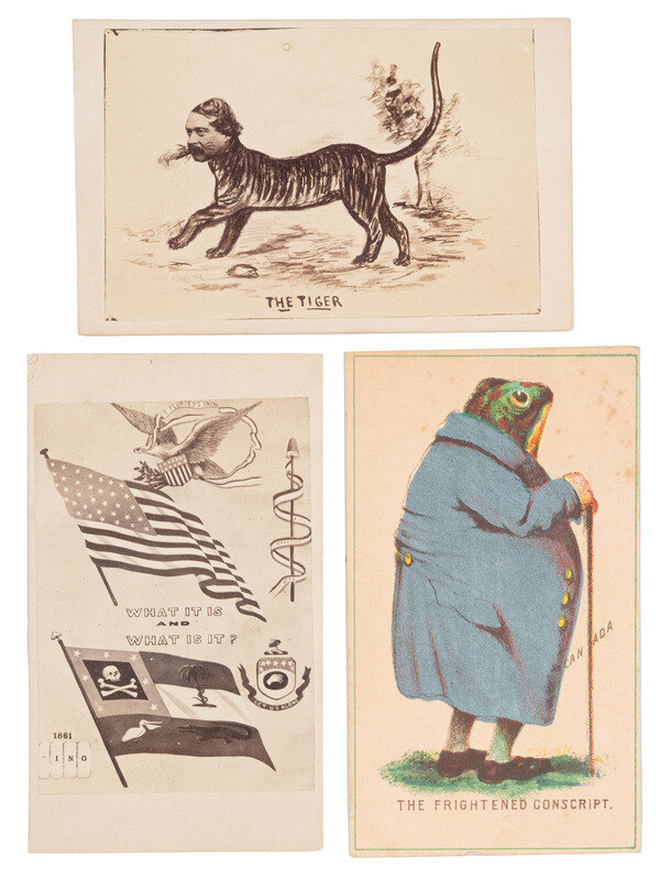 CDV featuring a landscape-oriented cartoon of a tiger with a man's head, the tiger's body and surroundings are sketched and the man's head is presented photographically. The title "The Tiger" is written into the cartoon. Uncredited, but with imprint on verso reading, "The last Likeness taken of The President and His Son Thaddeus." -- CDV featuring an illustrated collage of symbols including, centrally, an American flag and an unknown flag depicting a skull and crossbones surrounded by 7 stars in the canton, a palmetto tree, pelican, and alligator. Between the two flags is printed in block letters, "What it is and What is it?" Surrounding the flags are additional symbols including a liberty pole, an eagle, and others. Uncredited and uninscribed. -- CDV featuring a colorful cartoon portrait of a frog in a blue frock coat with a walking stick, titled below "The Frightened Conscript." On either side of the frog's walking stick is the word, "Canada." Uncredited and uninscribed. -- Together, 3 CDVs featuring Civil War era cartoons. Conditions vary, though generally fair.