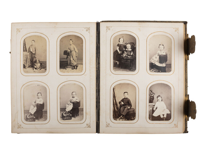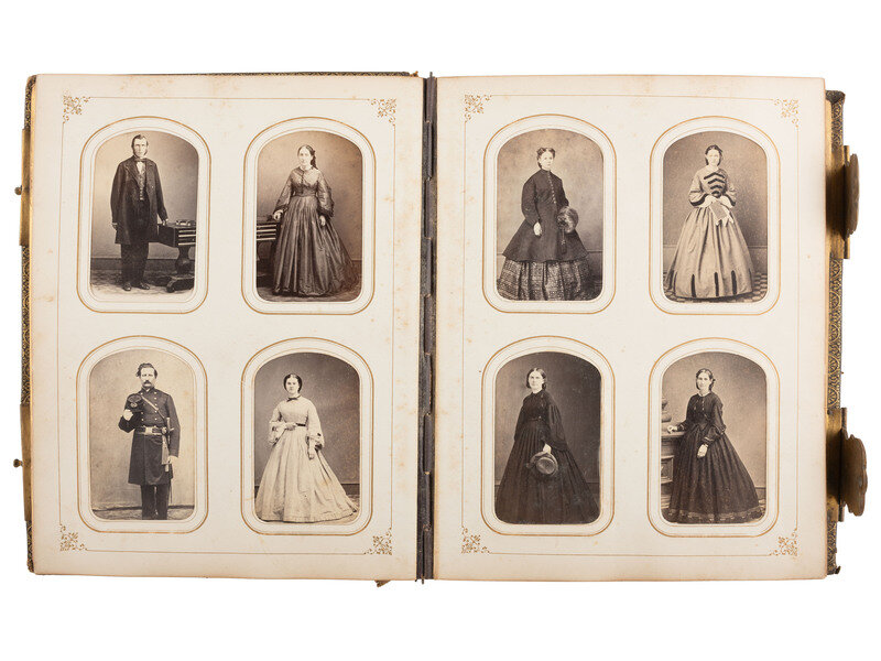 10 x 8 in. photo album identified in gilt on front cover to "M.M. Hunt," containing approx. 152 CDVs and tintypes of men, women, and children, most unidentified (most with trimmed/rounded edges and corners). The images are credited to photographers operating in New York and New Jersey, with many taken by I.G. Owen, Newton, NJ. Featured subjects include: CDV of a Union soldier standing in a studio, his cap in hand, which appears to have "NY" insignia on the front, verso imprint of Collins, Syracuse, NY. -- CDV of a second lieutenant, verso imprint of I.G. Owen, Newton, NJ. -- Multiple charming studio portraits of children, some posed in military-inspired uniforms, one posed with his dog, and one young girl posed beside a sculpture of a woman.