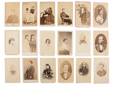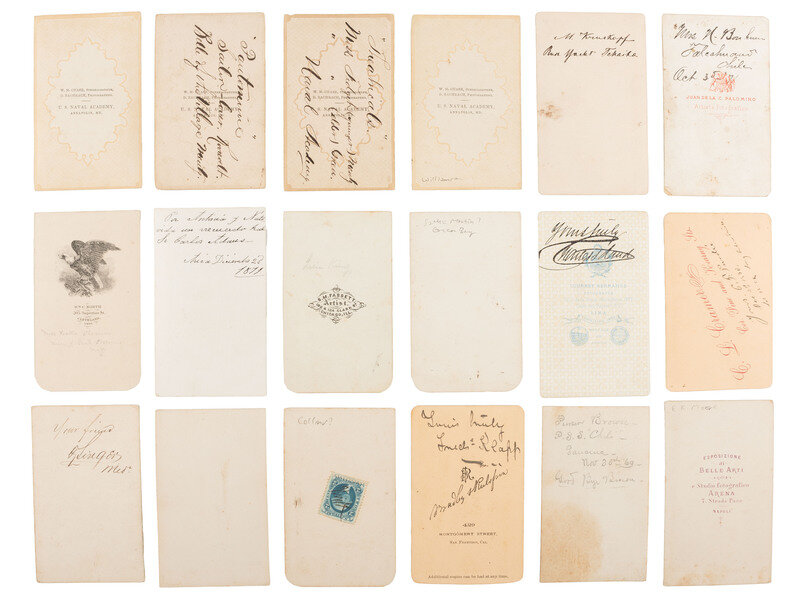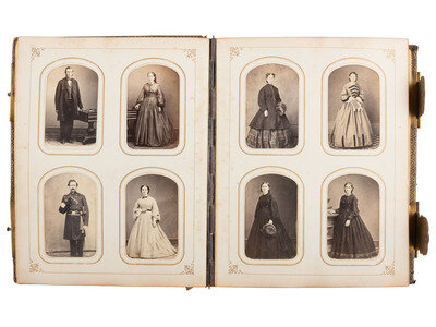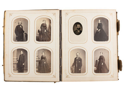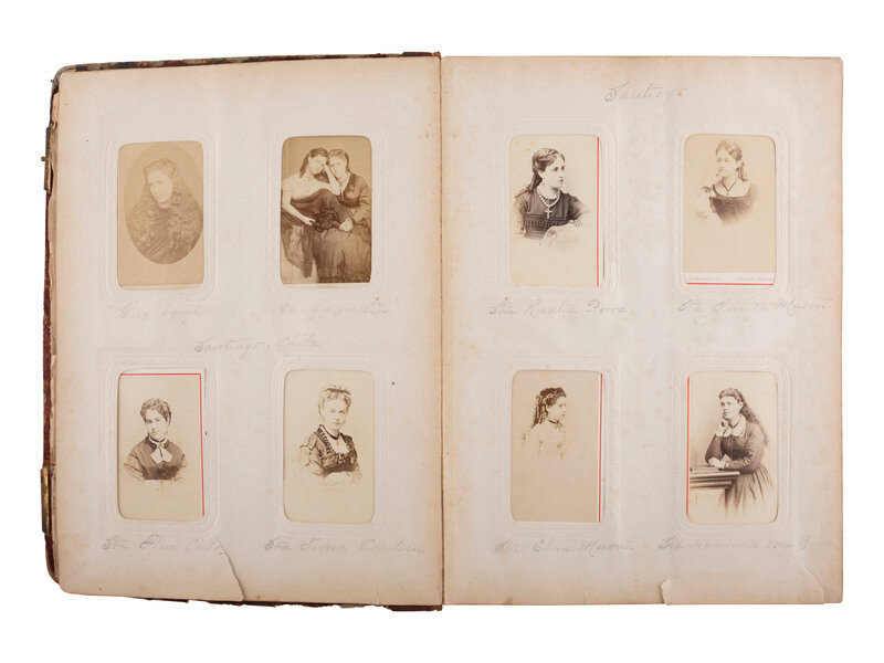 [With:] 12 1/4 x 9 in. photo album containing approx. 85 CDVs and tintypes, along with 3 photographs mounted in the front and back of the album, approx. 5 1/2 x 3 3 /4 in. or smaller, one showing a residence, one showing a group of three unidentified men, and one showing an interior view of a residence (covers heavily worn, with areas of loss throughout; note that album is incomplete with some cartes removed by previous owner). The images are credited to photographers operating throughout the United States and abroad, including Santiago and Valparaiso, Chile, and Lima, Peru. Some subjects are identified in period manuscript on mount or on accompanying album pages. While the original owner of the album is unclear, the contents indicate that the individual may have been in the Navy. Highlighted subjects include: Multiple CDVs of young women from Guayaquil, Ecuador, Santiago, Chile, Lima and Valparaiso, Peru, some of which are identified or signed by the subject on verso. -- CDV of a young man in naval uniform identified as "Raym Rodgers," verso imprint of Chase and Bachrach, US Naval Academy, Annapolis, MD. -- CDV of a young man in naval uniform, inscribed on verso, "F (?) Linger." Uncredited. -- C.S. Rand, private secretary for Henry Meiggs, Esq., as per penciled notation on album page, verso imprint of Hermanos, Lima. Signed on verso. -- Fred Clapp in civilian dress, penciled notation on album page indicates he was at the Navy Yard in California, verso imprint of Bradley & Rulofson, San Francisco. Signed on verso. -- C.F. Perdie, identified as "2nd Asst. Engineer," as per penciled notation on album page, imprint of Cramer, San Francisco. Signed and dated 1870 on verso. -- Officer with penciled notation on album page identified the gentleman as "E.K. Moore, Major ?," verso imprint of Esposizione di Belle Arti, Napoli. -- 2 CDVs of a male and female actors in costume, performing scenes at the Naval Academy, each with period manuscript notation on verso identifying the scene and subjects. Each with verso imprint of Chase and Bachrach, US Naval Academy, Annapolis, MD. -- Seated portrait of a young naval officer identified on album page as Chief Engineer Williamson, USN, verso imprint of Chase and Bachrach, US Naval Academy, Annapolis, MD. -- CDV of a mustachioed man identified on album page as Don Roger, Professor of Spanish, US Naval Academy, verso imprint of H.S. Clark, Green Bay, WI. -- CDV, outdoor view of a Naval subject standing aboard a ship, with period notation on verso that is difficult to discern. Uncredited. -- CDV, sated portrait of Purser Brown, PSS Chili, manuscript identification on verso dated 20 November 1869. Uncredited. -- Several photos of women and children, some identified on album pages, including portraits by S.M. Fassett, Chicago, IL, W.M. Knight, Buffalo, NY, Decker, Cleveland, OH, and H.S. Clark, Green Bay, WI.