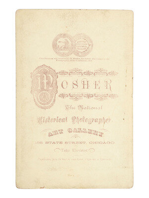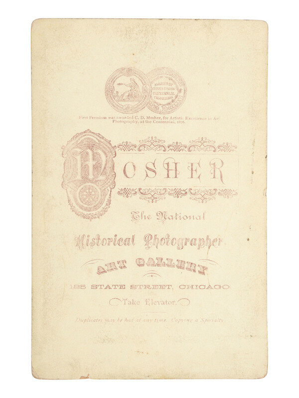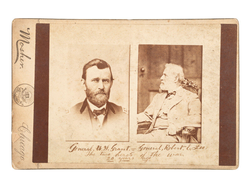 Cabinet card composite image featuring separate portraits of Ulysses S. Grant and Robert E. Lee (toning, soiling, spotting, wear). Chicago, IL: C. D. Mosher, n.d., ca 1880s. Photographer's imprint to recto and verso. Period ink inscription beneath portraits reads, "General. U. S. Grant. - General, Robert. E. Lee. / The two hero's [sic] of the war. / 20 years ago."