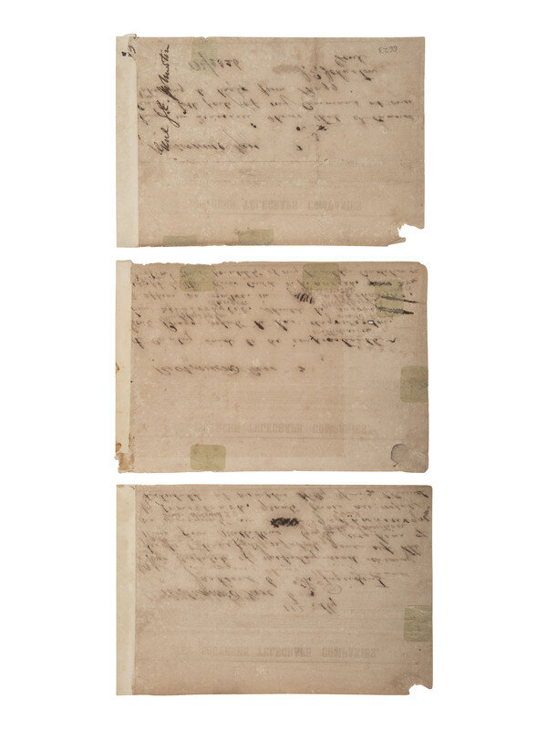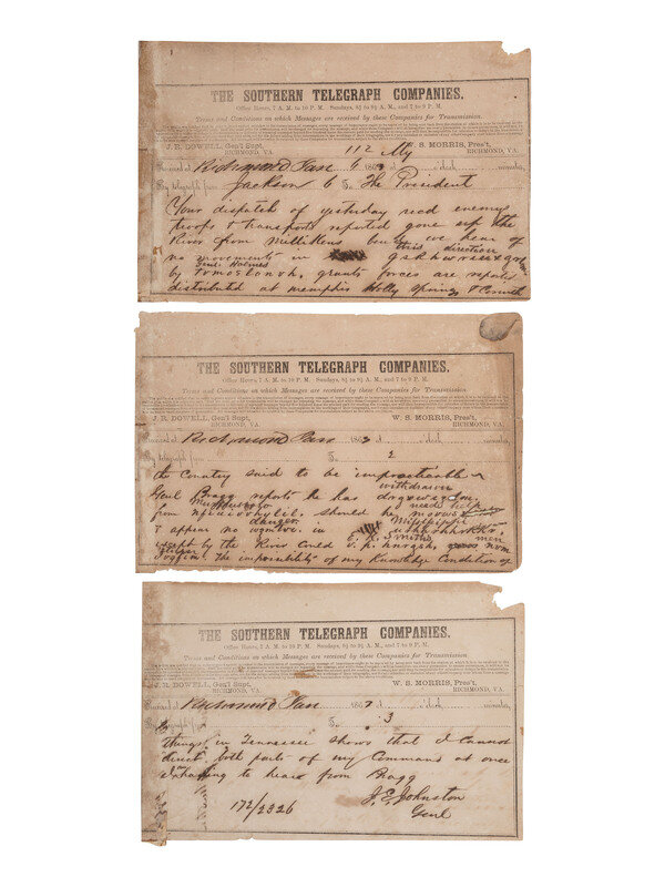 Three partially-printed "The Southern Telegraph Companies" sheets, each approx. 7 1/2 x 5 in., numbered 1-2-3 respectively, recording a telegram to "The President" received at "Richmond" from "J.E. Johnston Genl" at "Jackson." 6 January 1863. (Adhesive residue, toning, small losses).