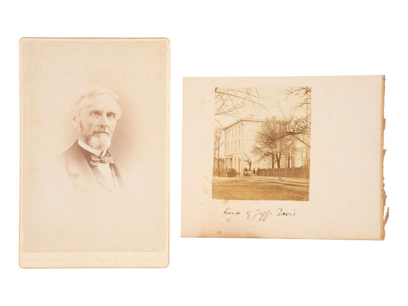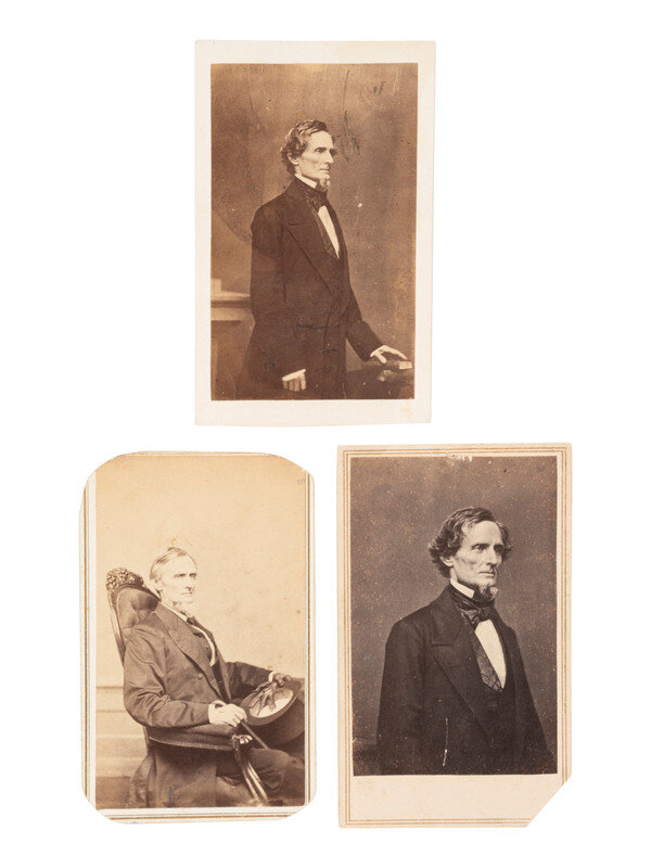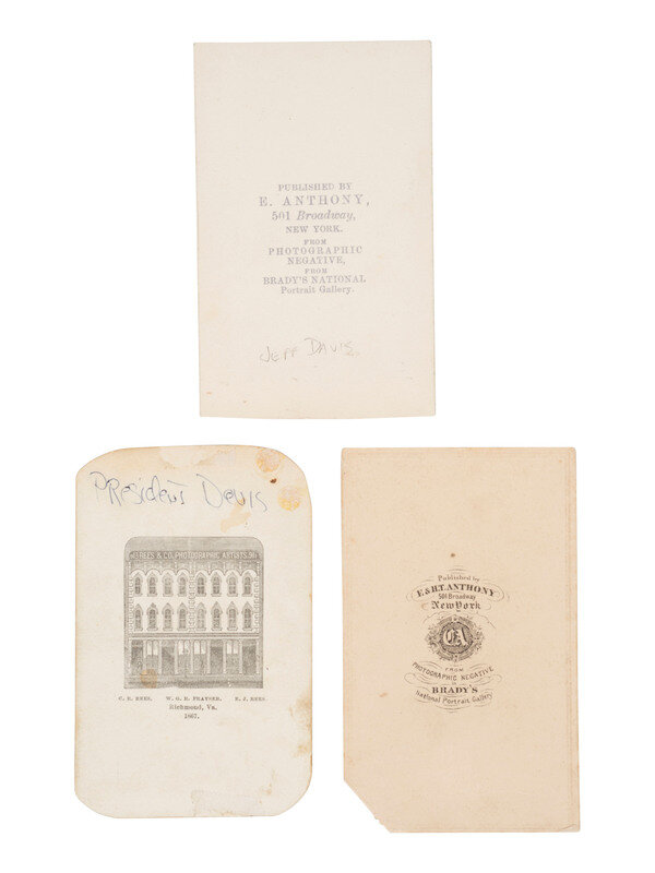 CDV standing portrait of Jefferson Davis in profile, showing his hand placed on a book as if about to take an oath. New York: E. Anthony (Brady Gallery negative). Imprint on verso. -- CDV seated portrait of a more mature Davis, holding a walking stick, a hat, and glove in his lap. Richmond, VA: Rees & Co, ca 1867. Photographer's pictorial imprint on verso. -- 2 3/4 x 3 1/8 albumen photograph mounted on cardstock album page featuring the mansion home of Jefferson Davis with a group of people standing outside. Uncredited but reportedly by Anderson & Ennis, after the war. Ink caption beneath image reads, "House of Jeff. Davis." -- And 2 others including a cabinet card of an aged Jefferson Davis and an additional Anthony/Brady CDV. -- Together, 5 images.