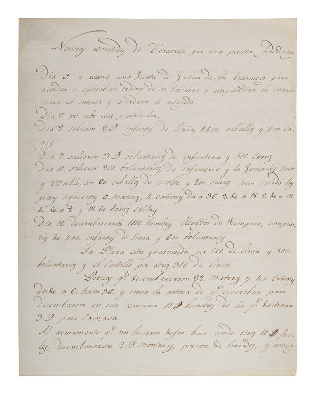 "Noticias remitidas de Veracruz por una persona fidedigna" (News sent from Veracruz by a reliable person"). Autograph manuscript, unsigned, in Spanish. Vera Cruz [Mexico], 12 April 1847. 2pp, bifolium, 8 1/2 x 10 3/4 in. Possibly intended for Gen. Cosme Furlong in Puebla. A Mexican spy delivers a day-by-day accounting of news related to "enemy" American troops in Veracruz.