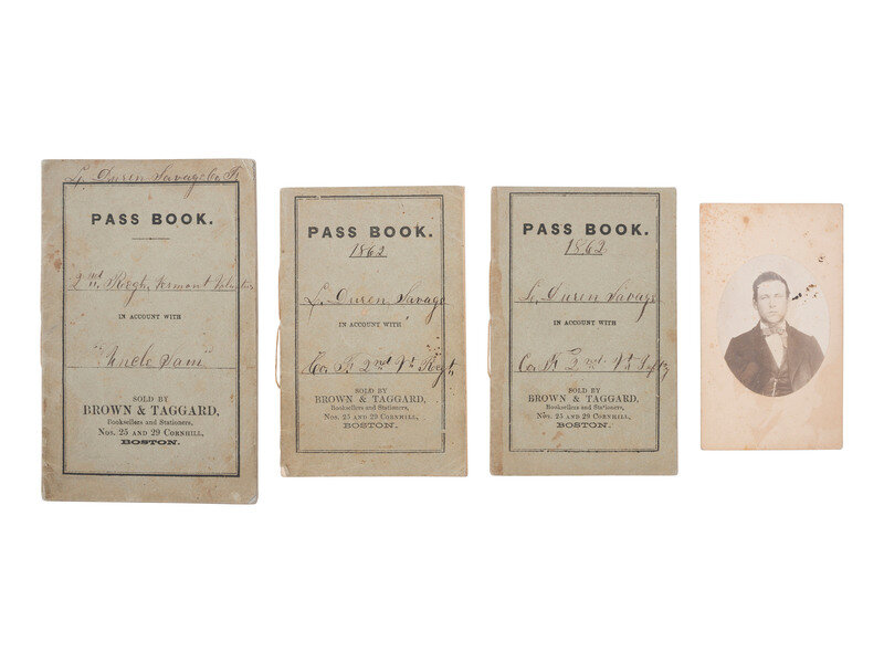 Group of three "Pass Books," ranging in size from 3 3/4 x 6 in. to 3 1/4 x 5 in., each repurposed by Private Lucius Duren Savage (1838-1900), Co. F, 2nd Vermont Infantry Regiment, for use as a diary and identified to Savage on the cover. Pass Books are 32pp, 25pp, and 25pp, respectively, with each page filled in entirety. Various places, November 1861-April 1862.