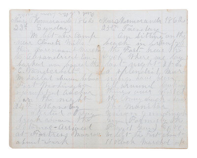 In late 1861 Savage was ordered to the Defences of Washington, then moved to Alexandria in March 1862 in the lead-up to the Peninsula Campaign. Sample entries include: "25th [March 1862] Tuesday AM sitting on the beach in front of the Fort near the dock Where we lay last night It is a splendid morning have been all around looking things over visited the Navy dock - saw the Monitor Union gun Lincoln Gun (formerly the Foyd Gun) etc etc We left The Fort about 11 o'clock Marched up the James River through what was once the Village of Hampton...." -- Writing regarding the engagement at Young's Mill: "4th [April 1862] Friday Started at 6 o'clock this morning up the river Marched up near Little Bethel where we were sent out skirmishing & scouting all of the 2nd Regt were scouting and skirmishing all day. We found their pickets below Tanner's Mills but they left at our approach Co. D captured one prisoner in the forenoon an Orderly Sergt he belonged to the Hampton Greys - at Tannys Mills they were fortified quite strong Barracks enough for 3 or 4 thousand troops they evacuated it before we got there...."