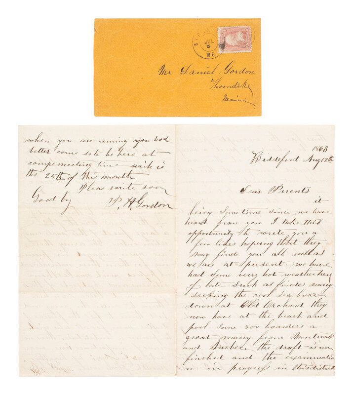 Letter written by P. H. Gordon of Biddeford, ME, to his parents in Thorndike, ME. 12 August 1863.