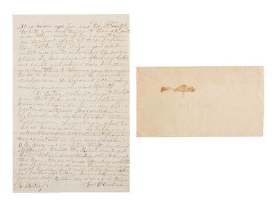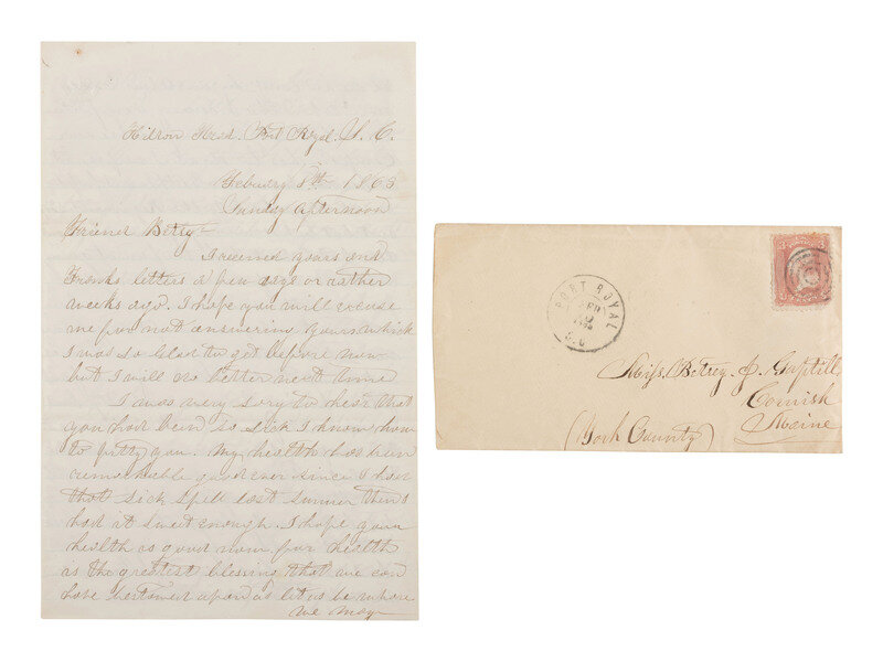 EASTMAN, George E. (1842-1865). Autograph letter signed ("Geo. E. Eastman"). Addressed to "Friend Betsy." "Hilton Head. Port Royal. S.C." 8 February 1863. 4pp, approx. 5 x 8 in. (creasing at folds, light toning). Accompanied by cover addressed to "Miss Betsey J. Gastill [sp?] / Cornish / Maine."